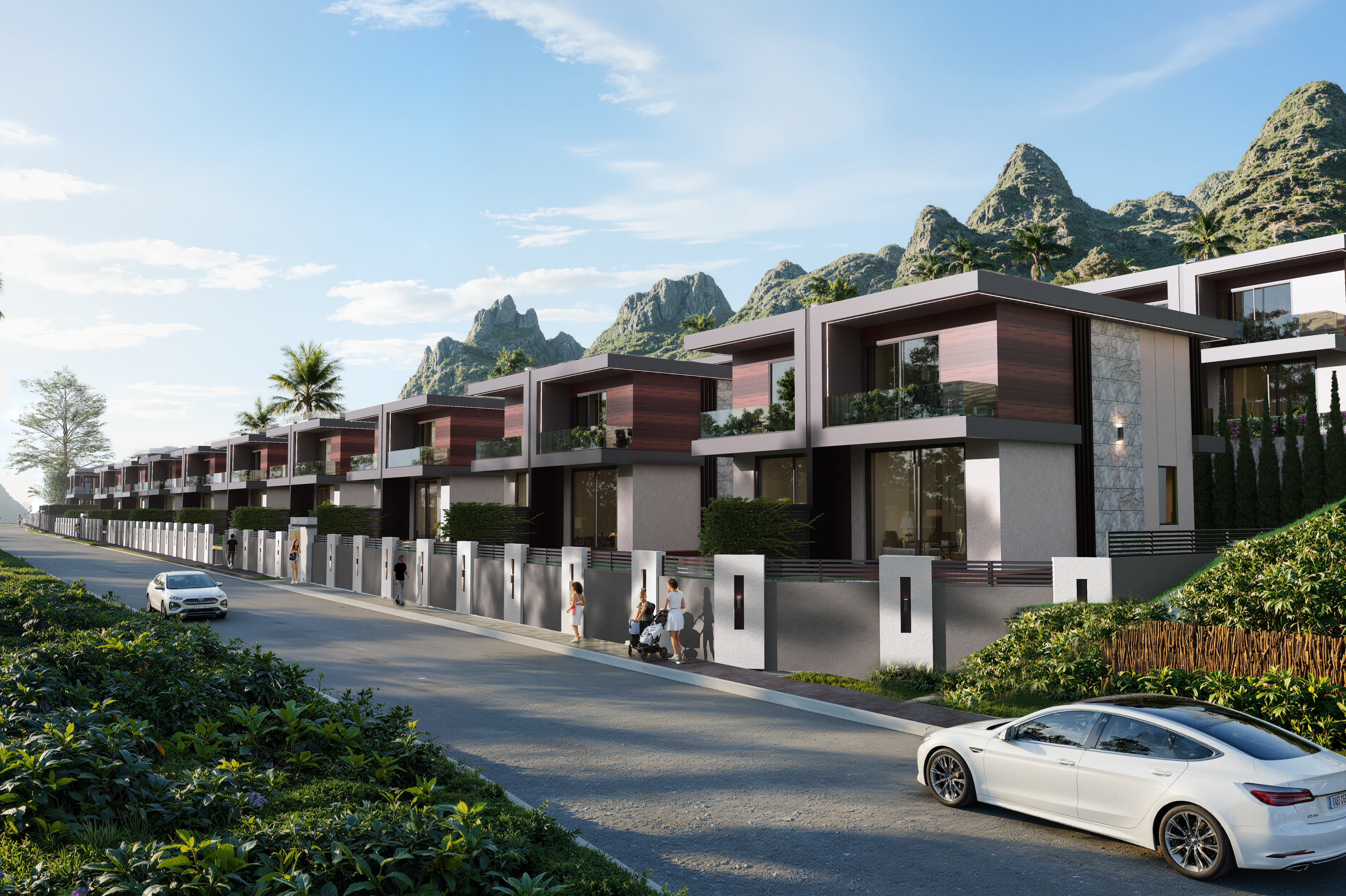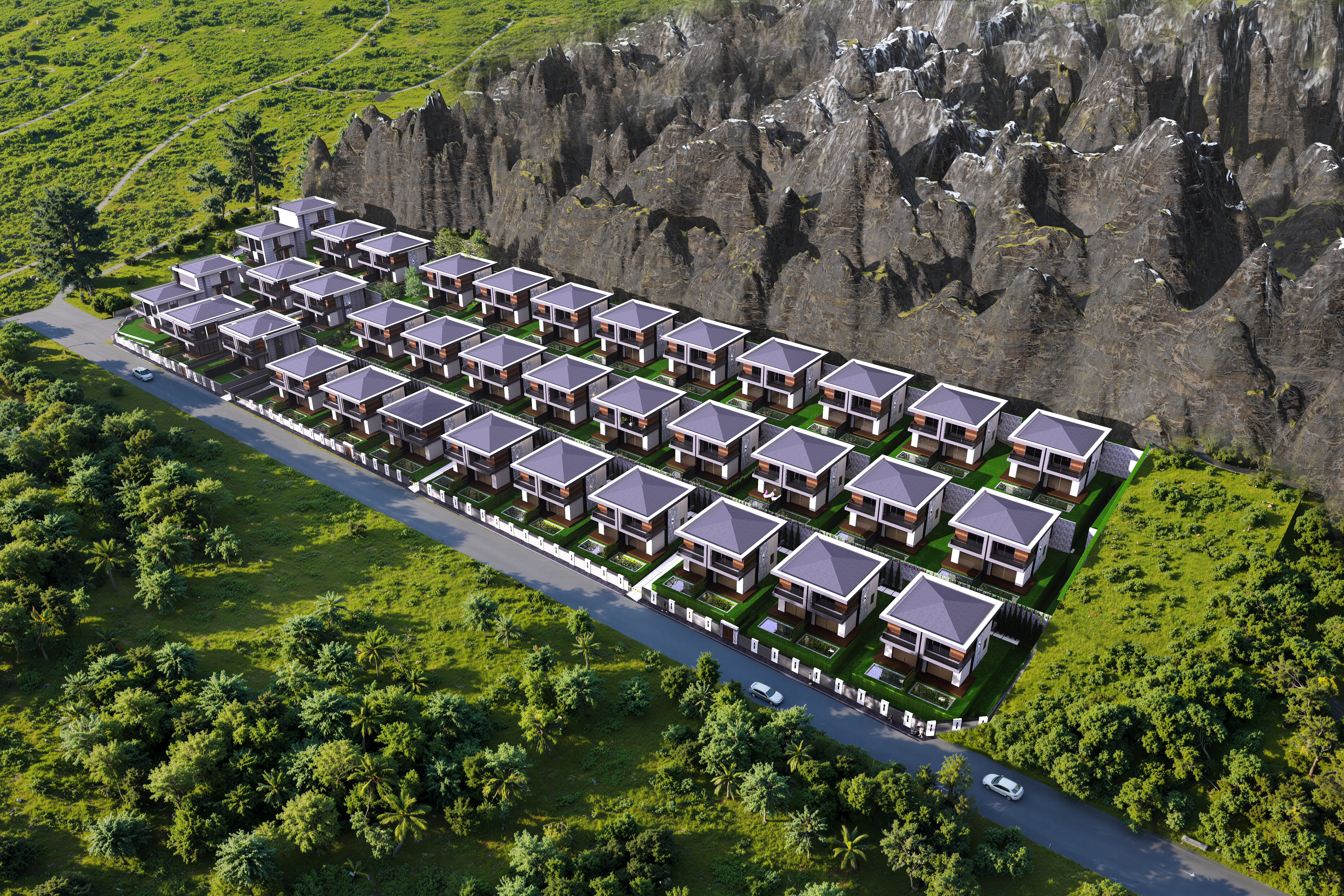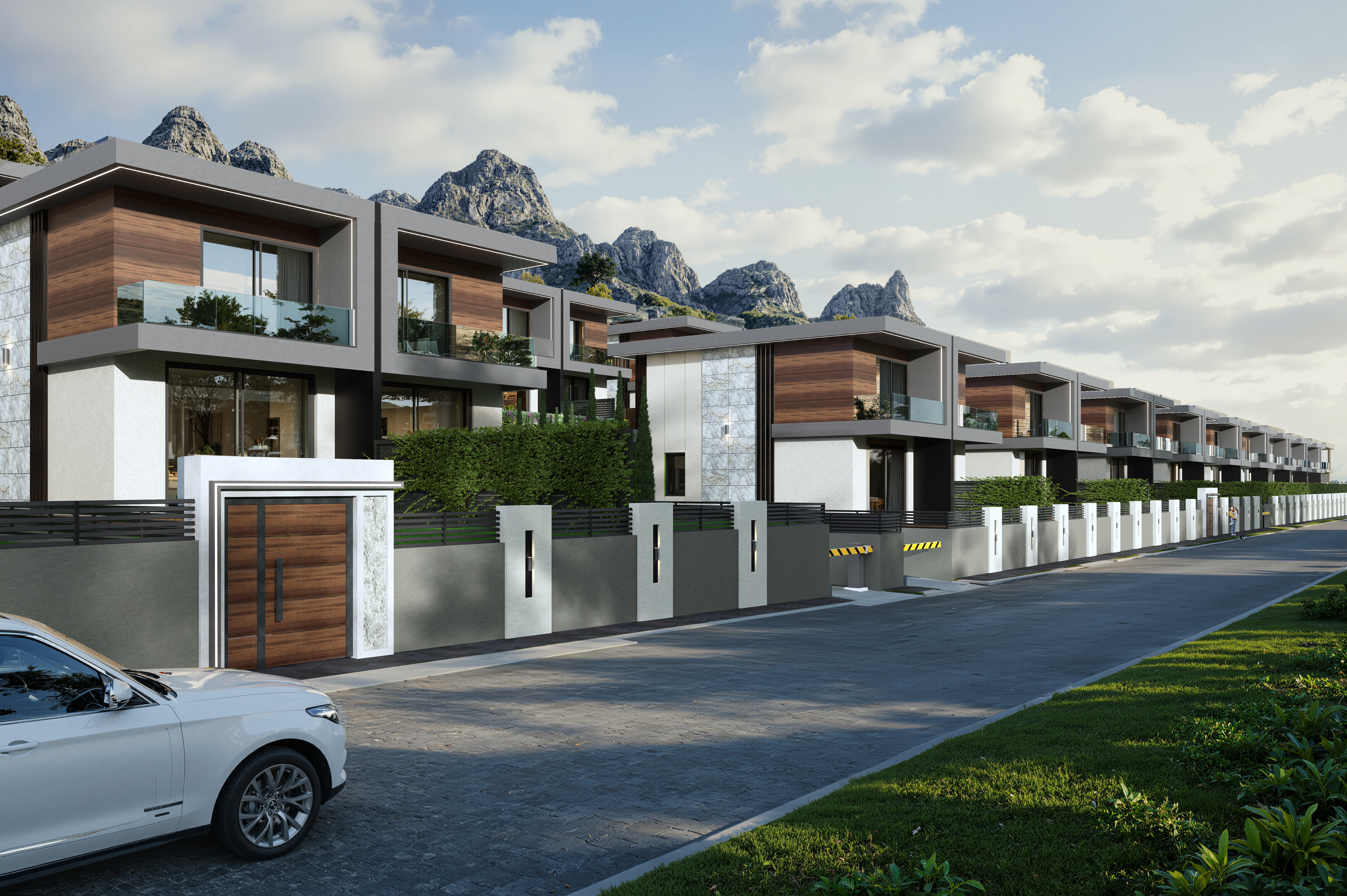 Antalya’nın iklimi ve doğal peyzajını referans alarak geliştirdiğimiz bu villa yerleşiminde, çağdaş konut mimarisini yalın ve dengeli bir tasarım yaklaşımıyla ele aldık. Yerleşim planını; gün ışığı kullanımı, yönlenme ve mahremiyet kriterleri doğrultusunda kurguladık, her bir villayı site bütününün parçası olan süreklilik içeren bir mekânsal sistem içerisinde konumlandırdık.